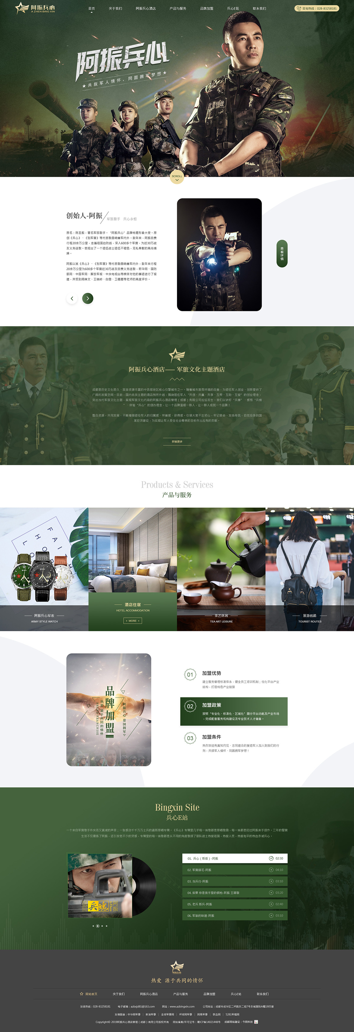 為響應國家大力發展軍民軍地融合、積極鼓勵退伍軍人干事創業的號召,由著名軍旅歌手阿振發起、四川擁軍模范鄭錦女士聯合創辦全國首家軍旅文化主題連鎖品牌酒店—阿振兵心酒店管理(成都)有限公司。本著“愛國、擁軍”的創業宗旨,圍繞軍旅文化主題,挖掘軍旅文化內涵,將軍旅文化元素融入到酒店的空間設計、環境打造、服務管理之中。