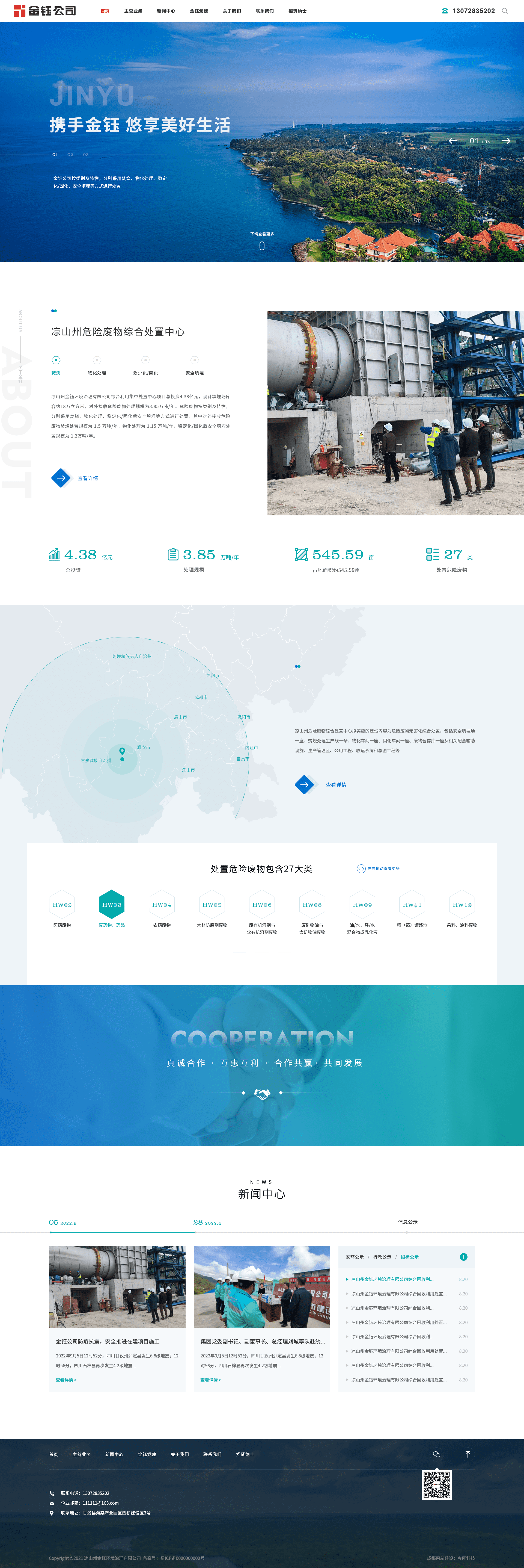 涼山州金鈺環境治理有限公司綜合利用集中處置中心項目總投資4.38億元,設計填埋場庫容約18萬立方米,對外接收危險廢物處理規模為3.85萬噸/年。危險廢物按類別及特性,分別采用焚燒、物化處理、穩定化/固化后安全填埋等方式進行處置,其中對外接收危險廢物焚燒處置規模為 1.5 萬噸/年,物化處理為 1.15 萬噸/年,穩定化/固化后安全填埋處置規模為 1.2萬噸/年。