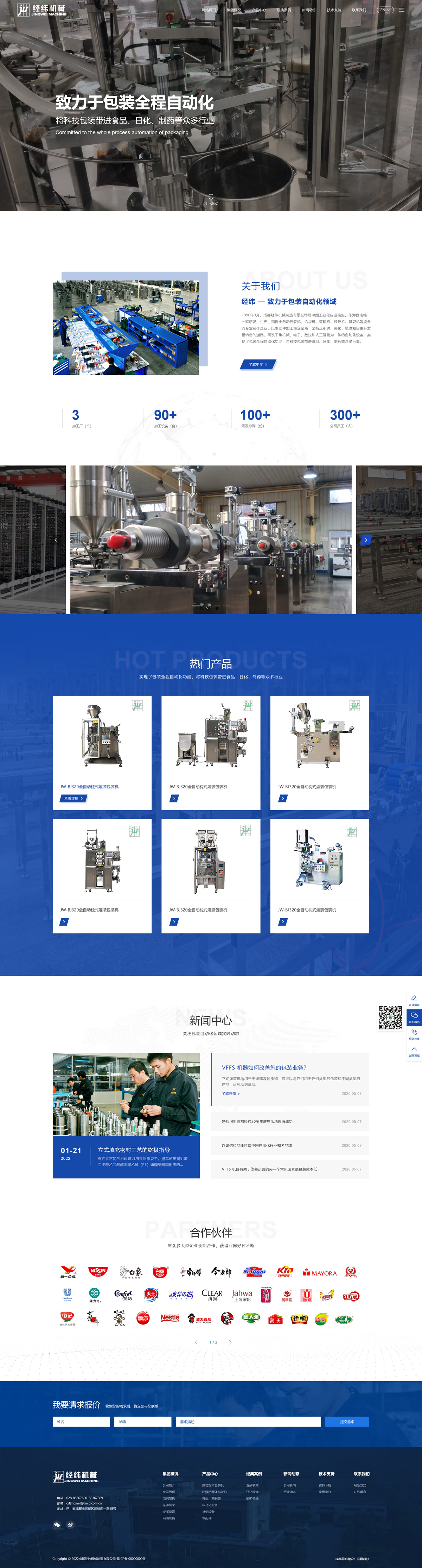 1996年3月,成都經(jīng)緯機(jī)械制造有限公司隨中國工業(yè)化應(yīng)運(yùn)而生。作為西南唯一一家研發(fā)、生產(chǎn)、銷售全自動包裝機(jī)、給袋機(jī)、裝箱機(jī)、投包機(jī)、疊袋機(jī)等設(shè)備的專業(yè)制作企業(yè)