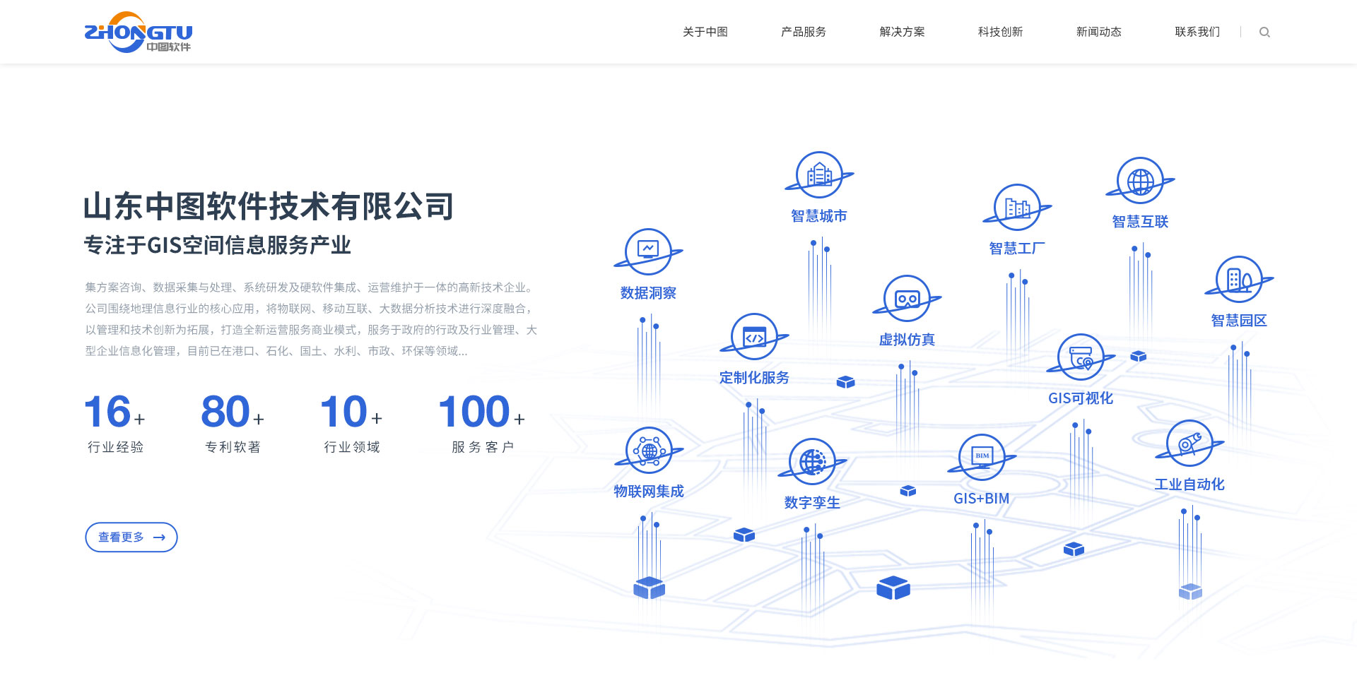 山東中圖軟件技術有限公司創立于2016年,我們以為客戶創造價值為己任,以提升客戶極致體驗為宗旨,以產品創新為核心,聚焦戰略客戶并提供長期服務,現已發展成為技術實力突出,服務智慧園區、智慧城市、軍工多個業務領域的創新型科技企業。