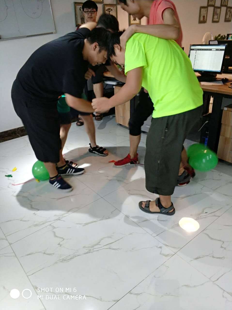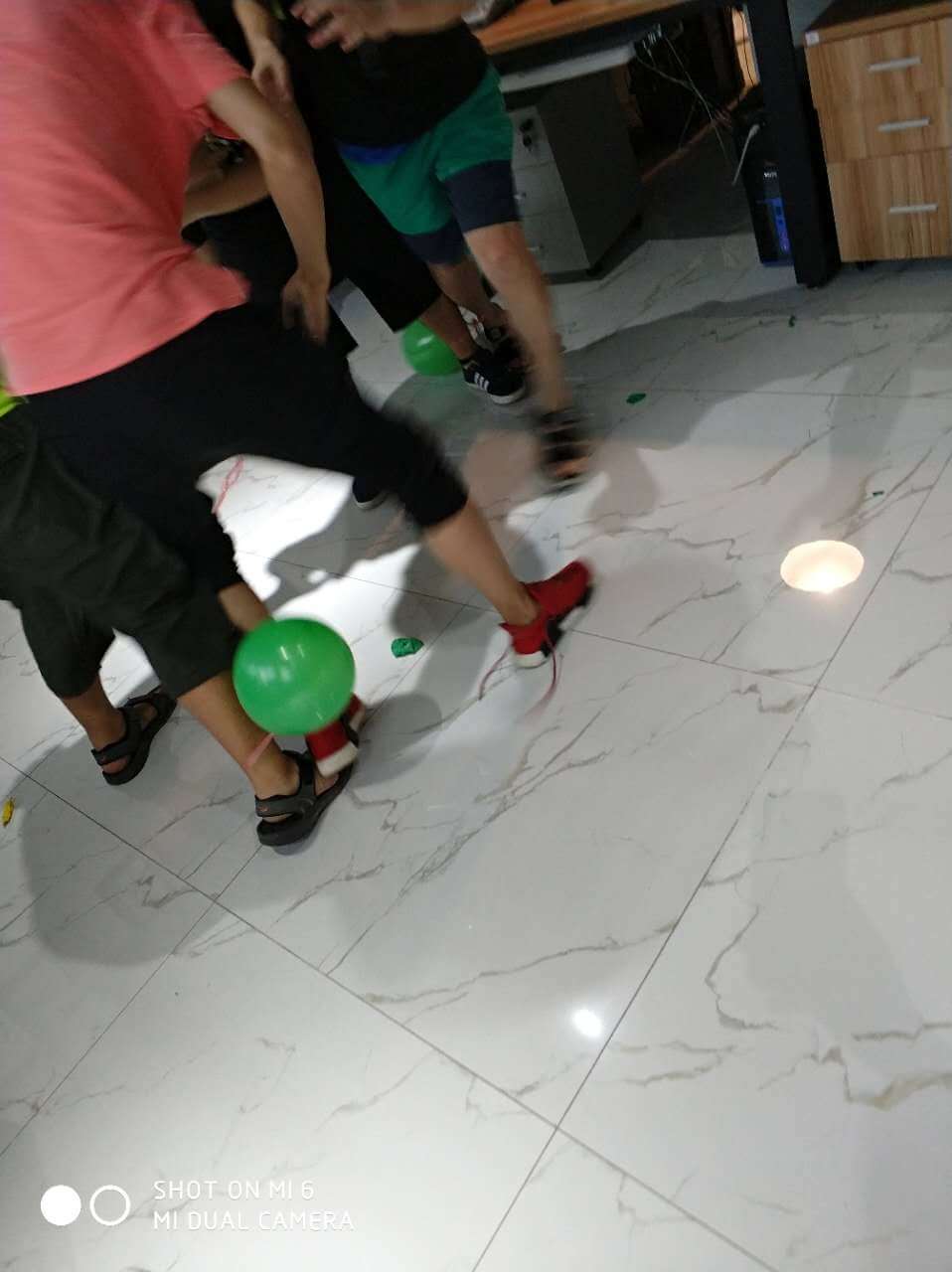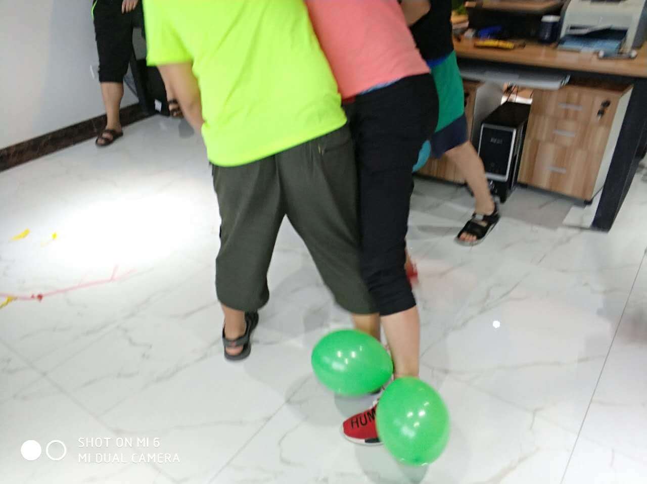 時(shí)間過得相當(dāng)?shù)目欤唤?jīng)意就來到了最后一個(gè)環(huán)節(jié),踩氣球。兩隊(duì)每?jī)蓚€(gè)成員綁上氣球,相互對(duì)抗,踩爆他的球~~~噢!!!小編似乎看到了一場(chǎng)血雨腥風(fēng)。