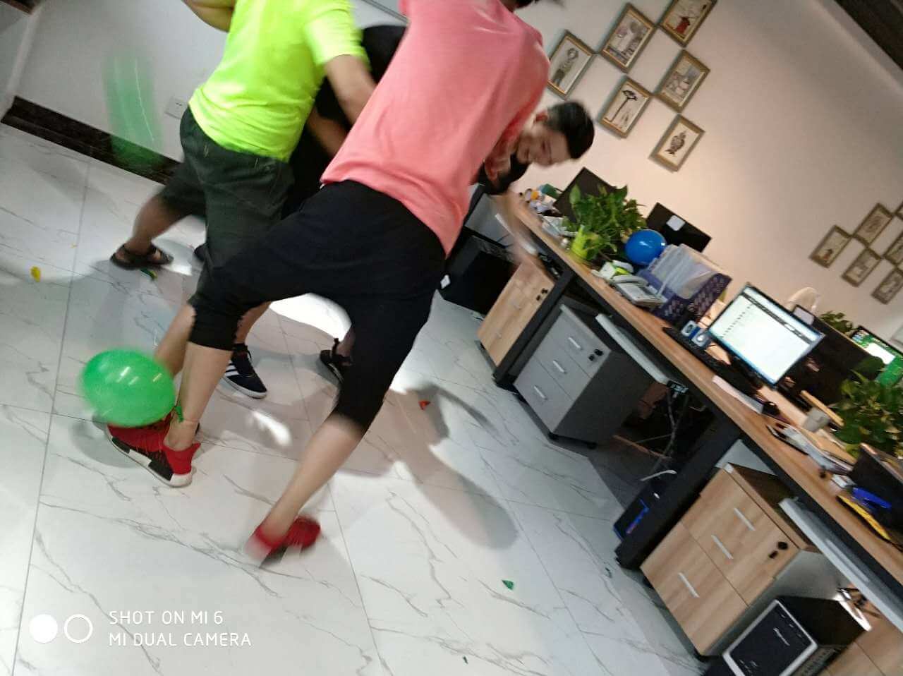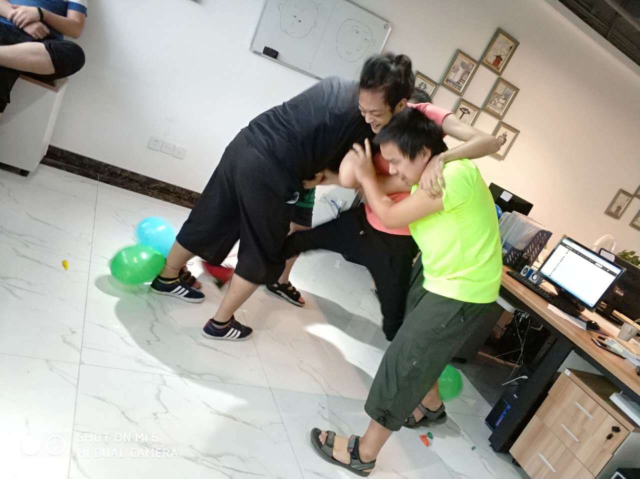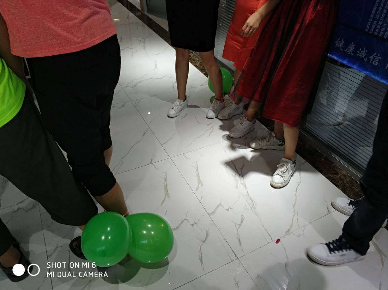 時(shí)間過得相當(dāng)?shù)目欤唤?jīng)意就來到了最后一個(gè)環(huán)節(jié),踩氣球。兩隊(duì)每?jī)蓚€(gè)成員綁上氣球,相互對(duì)抗,踩爆他的球~~~噢!!!小編似乎看到了一場(chǎng)血雨腥風(fēng)。